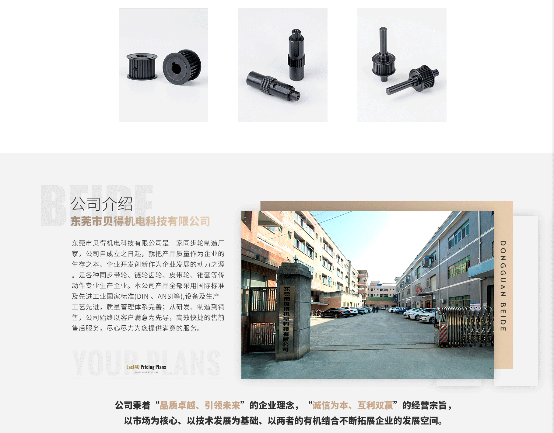 東莞市貝得機電科技有限公司是專業(yè)同步輪制造廠家,公司自成立之日起,就把產(chǎn)品質(zhì)量作為企業(yè)的生存之本、企業(yè)開發(fā)創(chuàng)新作為企業(yè)發(fā)展的動力之源,是各種同步帶輪,同步輪,同步帶,齒輪,鏈輪,同步帶,皮帶輪,多楔輪,歐標(biāo)皮帶輪,歐標(biāo)錐套,脹緊套,聯(lián)軸器等傳動件專業(yè)生產(chǎn)企業(yè)。
