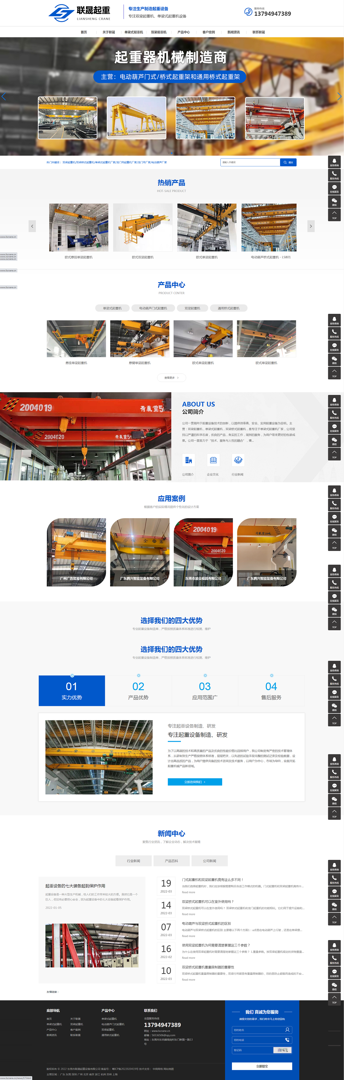 東莞市聯(lián)晟起重設(shè)備有限公司 公司一貫傾向于起重設(shè)備技術(shù)的創(chuàng)新,以提供效率高、安全、實用起重設(shè)備為目標。主營:雙梁起重機,單梁式起重機,雙梁橋式起重機,是專注于單梁式起重機廠家,公司堅持以嚴謹?shù)目茖W(xué)態(tài)度,優(yōu)良的產(chǎn)品,務(wù)實的工作,周到的服務(wù),為用戶帶來更好的包裝成果。公司一直致力于“技術(shù)、服務(wù)與人性的融合”,秉持“信譽至上”原則。并將更加不懈努力,換取更多客戶愛戴,衷心希望各界用戶更多的支持和幫助。公司不斷增加技術(shù)投資,不斷進行技術(shù)革新,提高產(chǎn)品科技含量,吸收和消化國內(nèi)外起重行業(yè)的創(chuàng)新設(shè)計和先進工藝,全力打造我公司產(chǎn)品質(zhì)量的新起點,滿足市場對起重設(shè)備的新需求,與國際同類產(chǎn)品接軌,占領(lǐng)市場制高點。