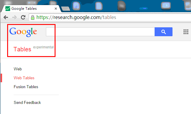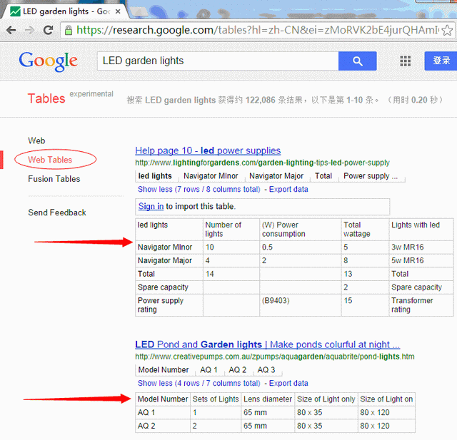 注意在 Google Tables 中,默認(rèn)為網(wǎng)頁(yè)中的表格(以上紅色字體 Web Tables)。下面還有 Fusion Tables可選。